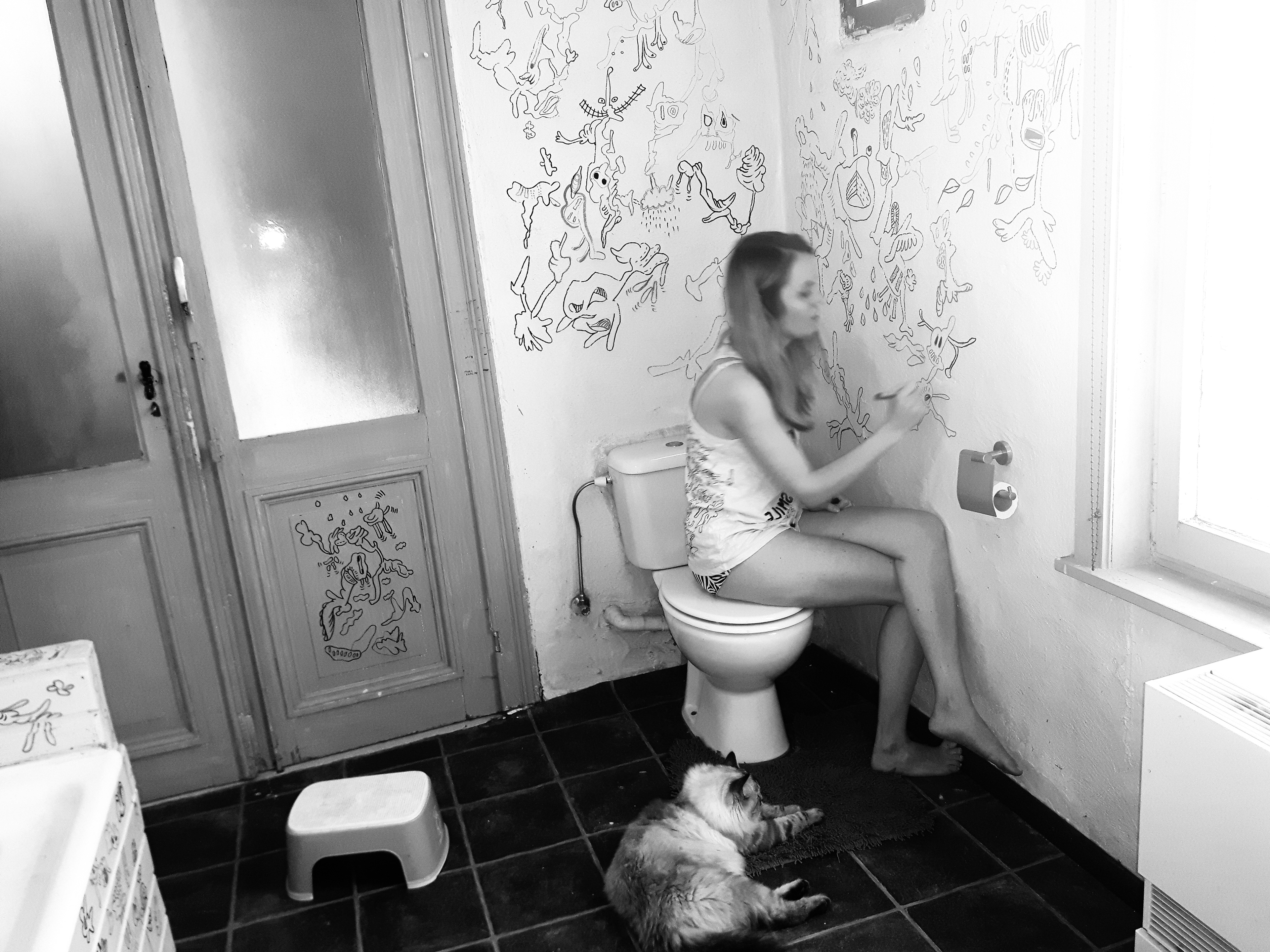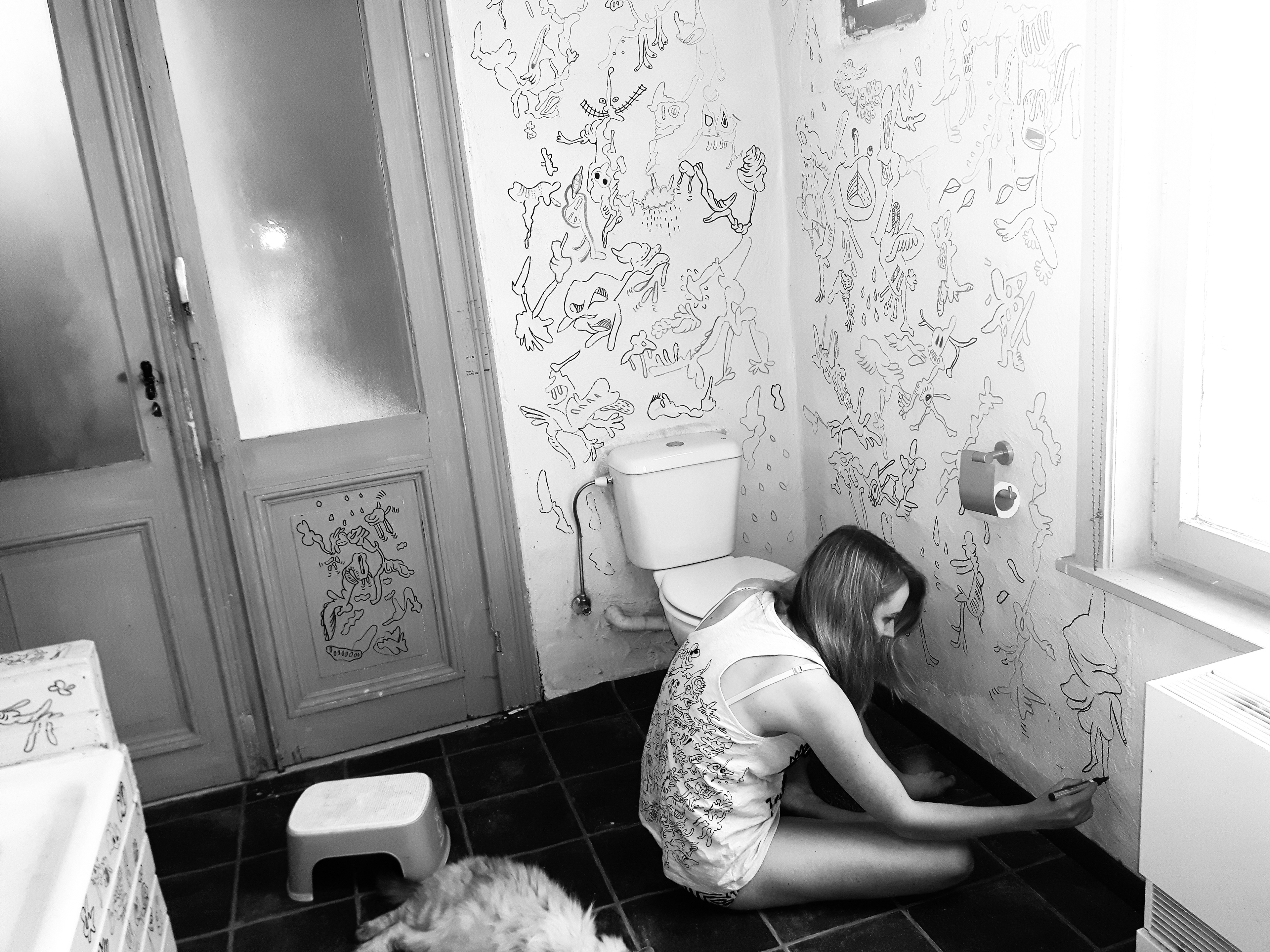 Jook is doodling on the walls of her bathroom